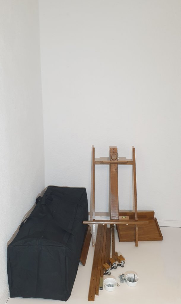 Diese Staffelei kann komplett für den Transport zerlegt werden. In einer kleinen Variante kann sie zu einer kleinen Tischstaffelei zusammengebaut werden.