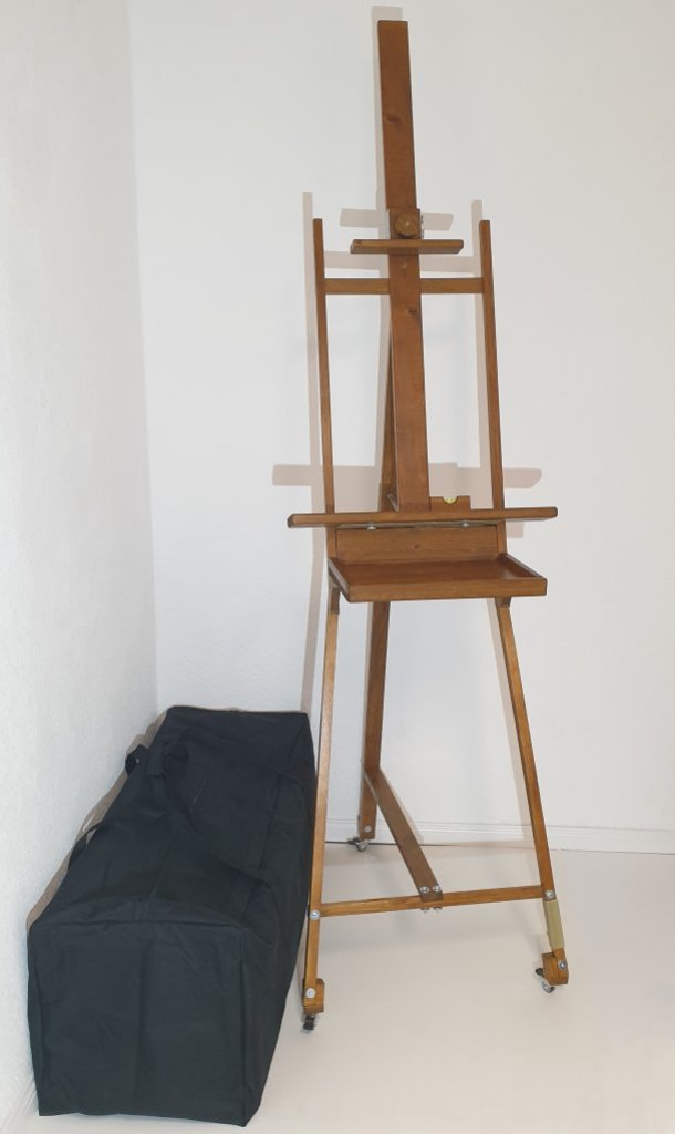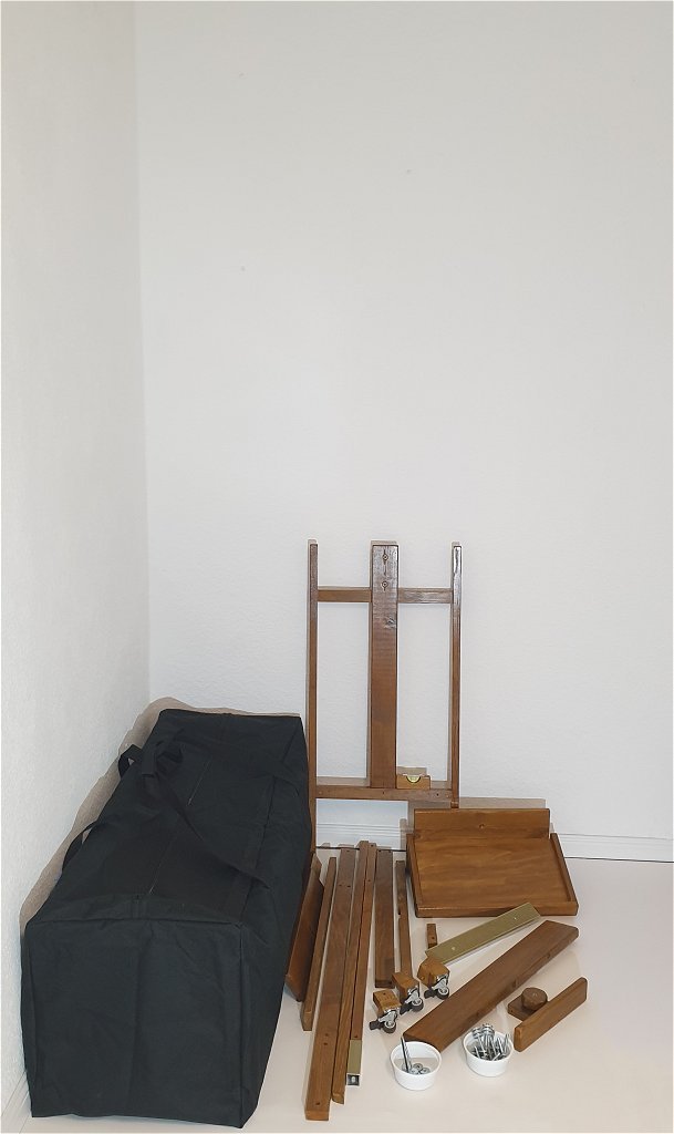 Diese Staffelei kann komplett für den Transport zerlegt werden. In einer kleinen Variante kann sie zu einer kleinen Tischstaffelei zusammengebaut werden.